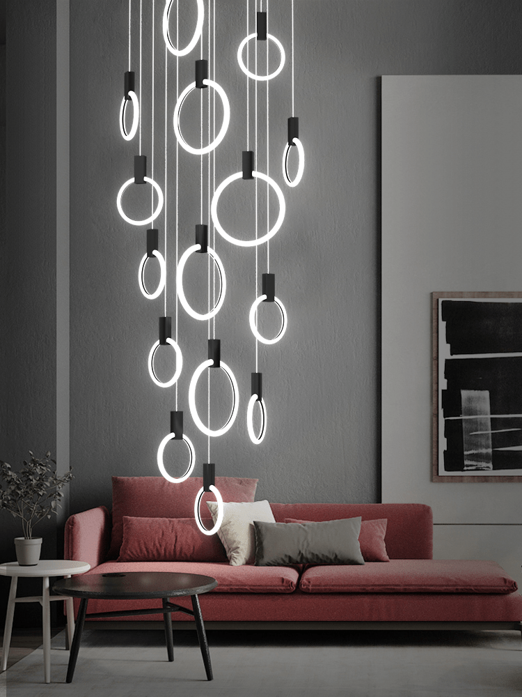 Der Kronleuchter ist sowohl in runder als auch in rechteckiger Deckensockelausführung erhältlich und bietet so Flexibilität für unterschiedliche Raumaufteilungen und Vorlieben. Die Anzahl der Lichtringe variiert je nach Größe und bietet so die Möglichkeit, Ihren spezifischen Beleuchtungsbedürfnissen gerecht zu werden.