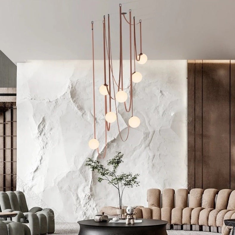 Elevate your interior with the Hanging Belt Globes Chandelier, a stunning lighting fixture that blends classical elegance with post-modern design. Featuring a distinctive belt-style suspension and graceful white globe lampshades, this chandelier adds sophistication and visual intrigue to any space.