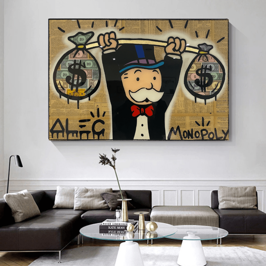 Trasforma il tuo spazio in una galleria d'arte con Alec Monopoly Arte da Parete: Sacchi di Denaro Potere, dove ogni pezzo aggiunge profondità e fascino.