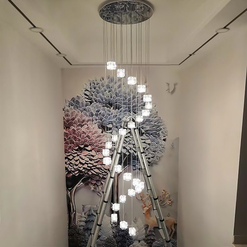 Погрузитесь в очарование Люстра из квадратных кристальных кубов– где свет, форма и функция переплетаются, чтобы переосмыслить атмосферу в помещении.