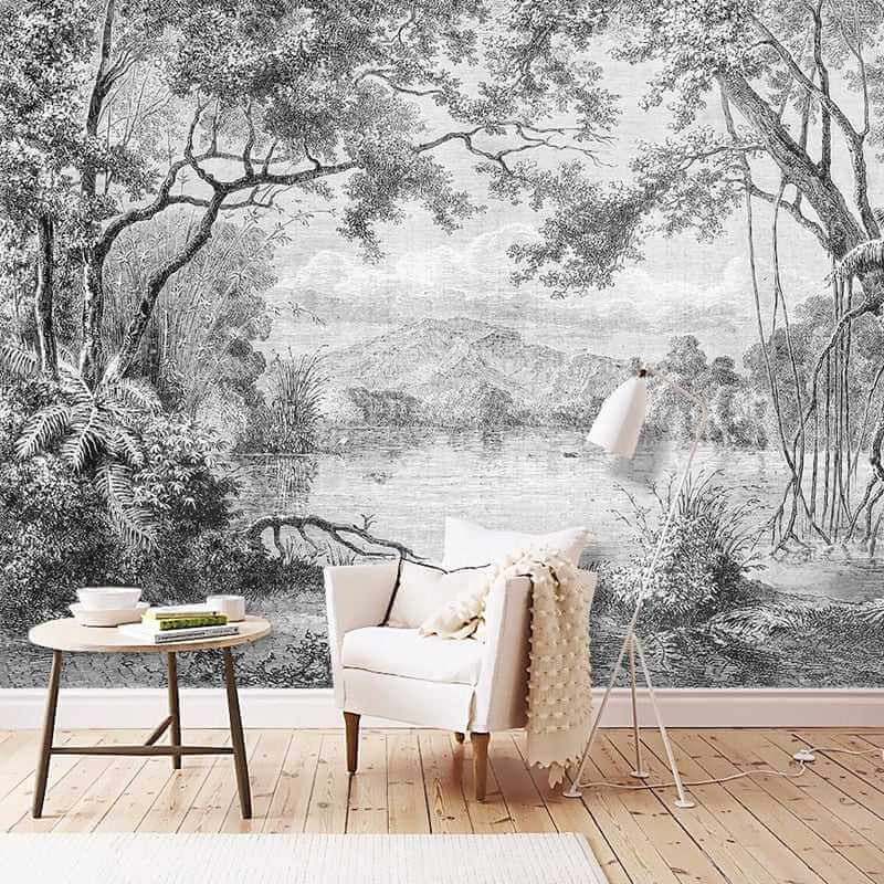 Шепчущие тени: черно-белые обои с лесом
